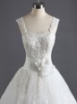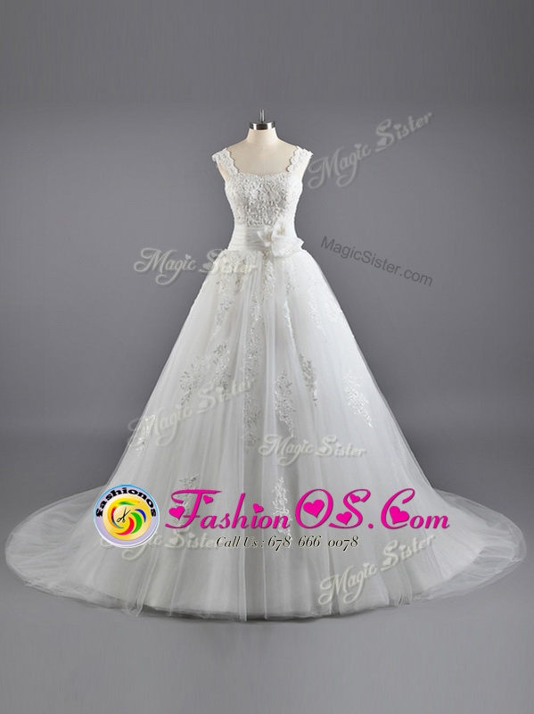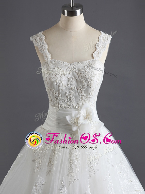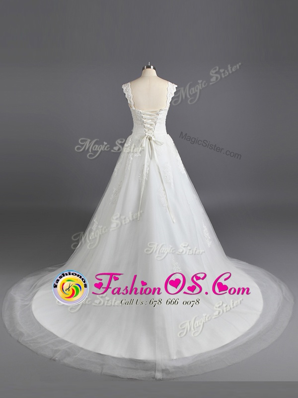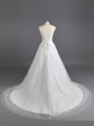Fitting Lace Wedding Gown White Lace Up Sleeveless Court Train