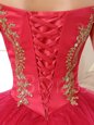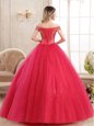 Fitting Red Ball Gowns Off The Shoulder Sleeveless Tulle Floor Length Lace Up Appliques and Sequins Quinceanera Dresses