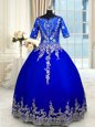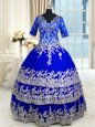 Fitting Royal Blue Zipper Quinceanera Dress Appliques and Ruffled Layers Half Sleeves Floor Length