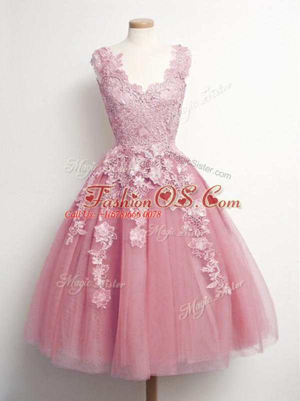 Fitting Sleeveless Tulle Knee Length Lace Up Court Dresses for Sweet 16 in Pink with Appliques