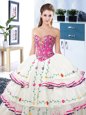 Fitting Sweetheart Sleeveless Quince Ball Gowns Floor Length Embroidery and Ruffled Layers White Organza and Taffeta