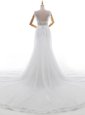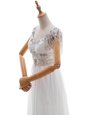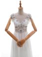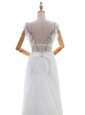 Fitting White Chiffon Side Zipper V-neck Cap Sleeves With Train Wedding Gown Chapel Train Beading and Bowknot