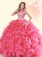 Flare Backless Floor Length Coral Red Quinceanera Dress Organza Sleeveless Beading and Ruffles