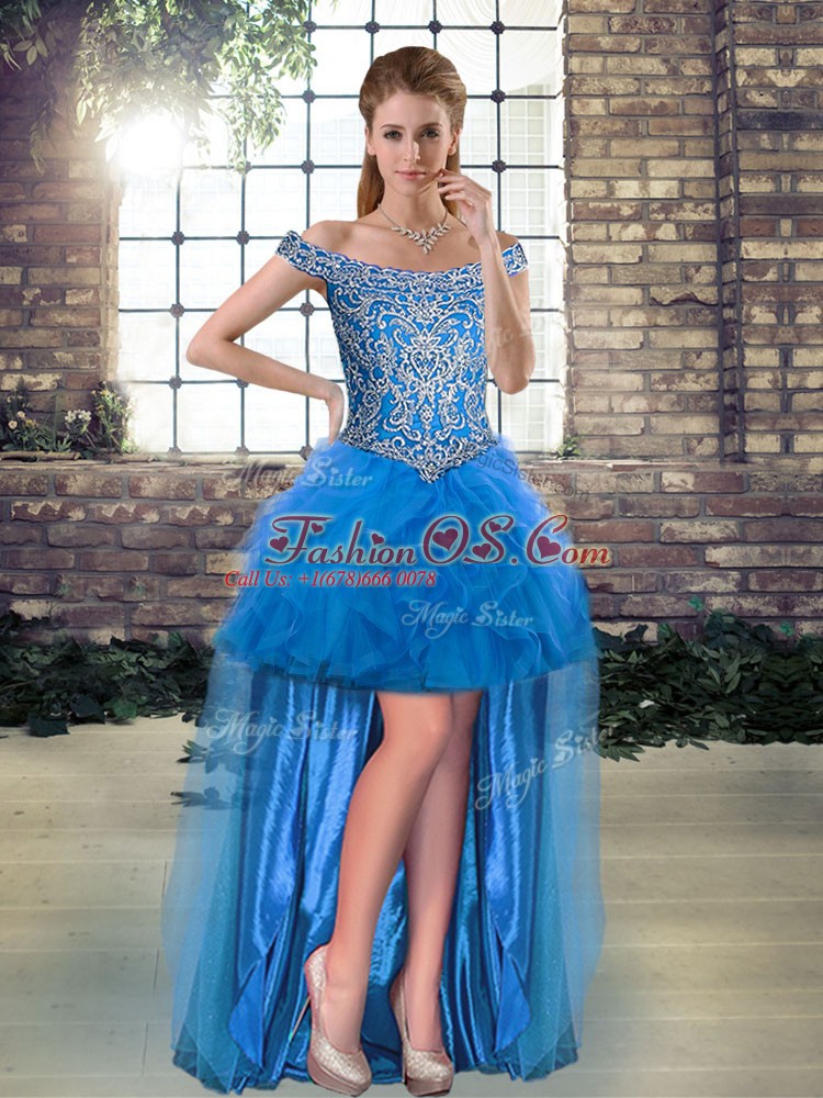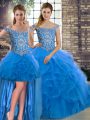 Flare Blue Sleeveless Brush Train Beading and Ruffles Quinceanera Gown