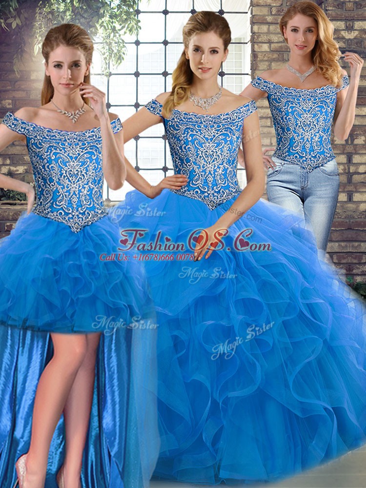 Home >  Quinceanera Dresses >  Detachable Quinceanera Skirts > Flare Blue Sleeveless Brush Train Beading and Ruffles Quinceanera Gown