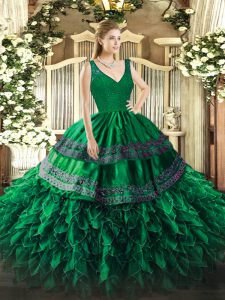 Flare Floor Length Dark Green Quince Ball Gowns V-neck Sleeveless Backless