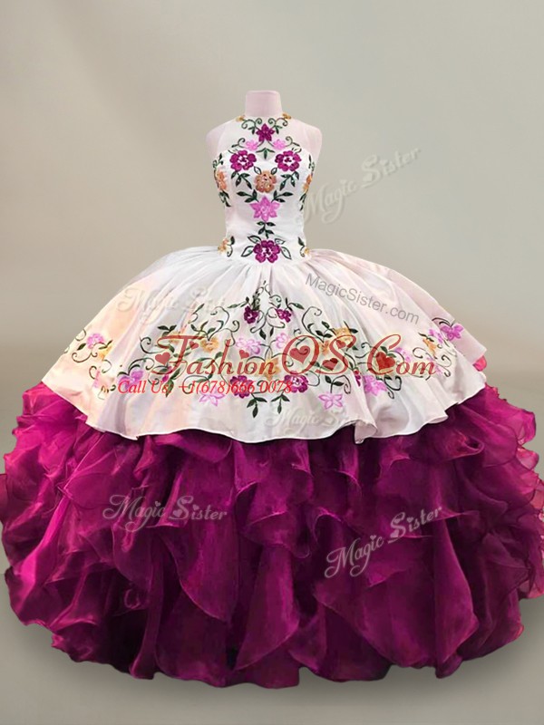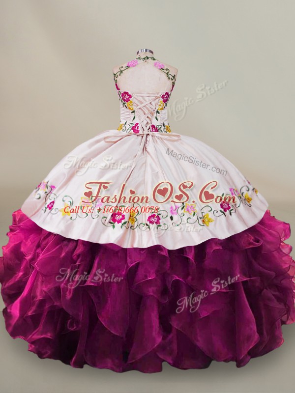 Flare Floor Length Fuchsia 15th Birthday Dress Halter Top Sleeveless Lace Up
