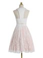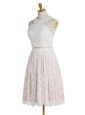 Flare Lace Pink And White Prom Gown Prom and For with Beading Halter Top Sleeveless Zipper