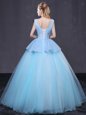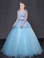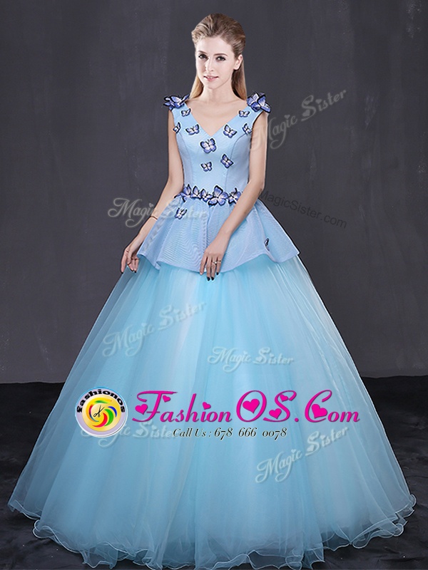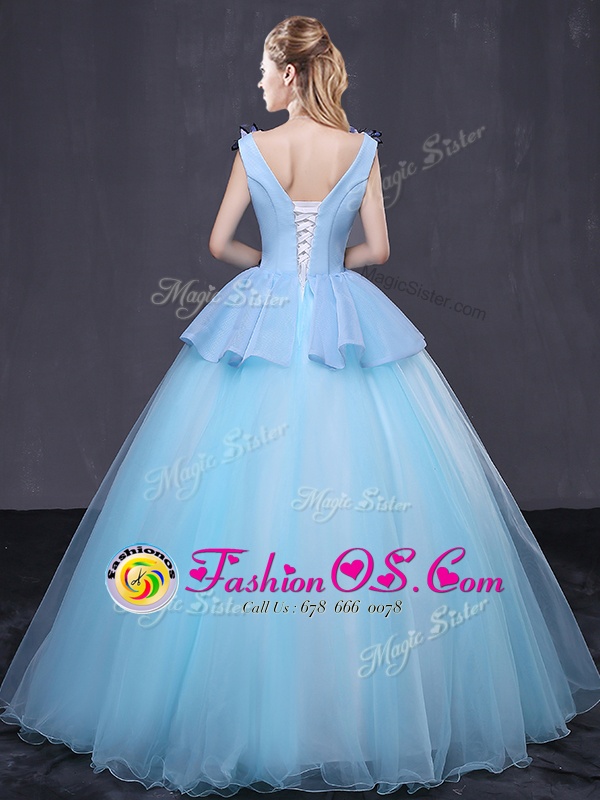 Flare Light Blue 15th Birthday Dress Military Ball and Sweet 16 and Quinceanera and For with Appliques V-neck Sleeveless Lace Up