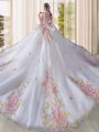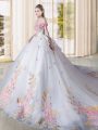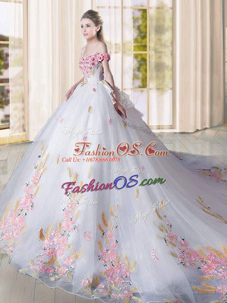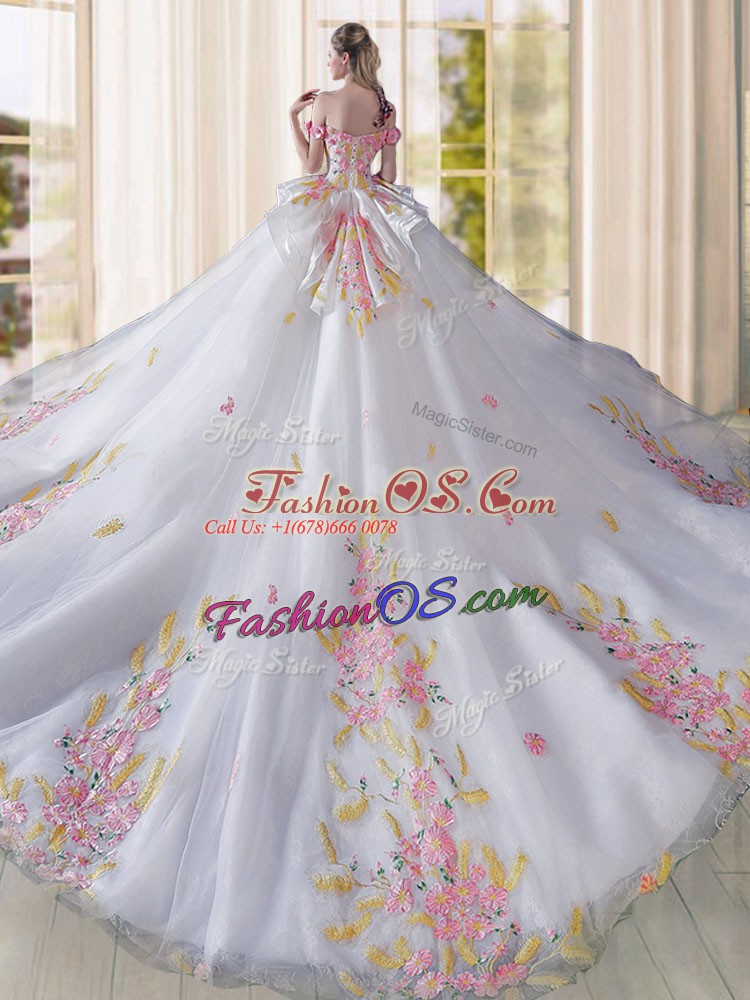 Flare Off The Shoulder Sleeveless Cathedral Train Lace Up Quinceanera Dress White Tulle