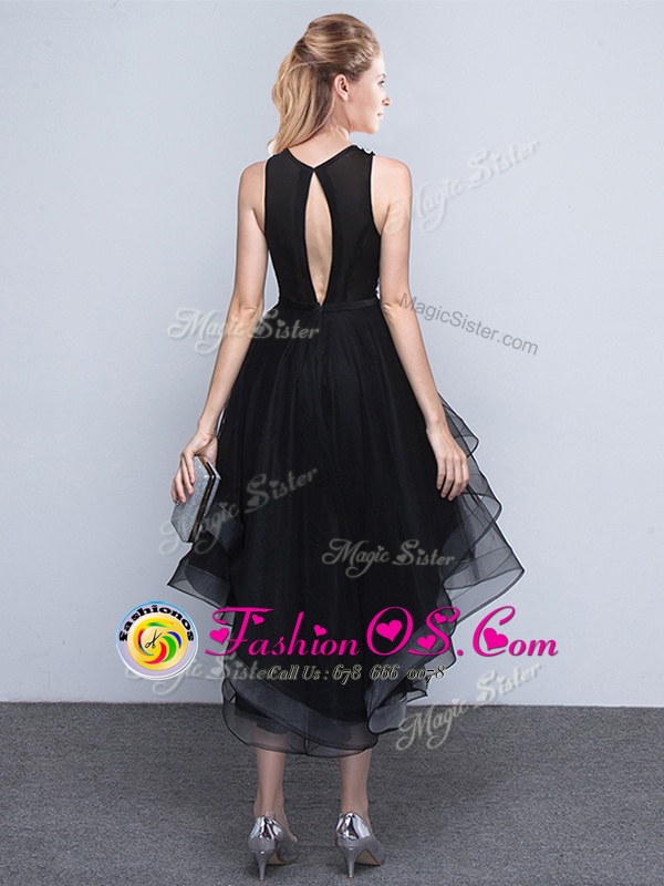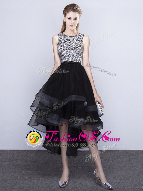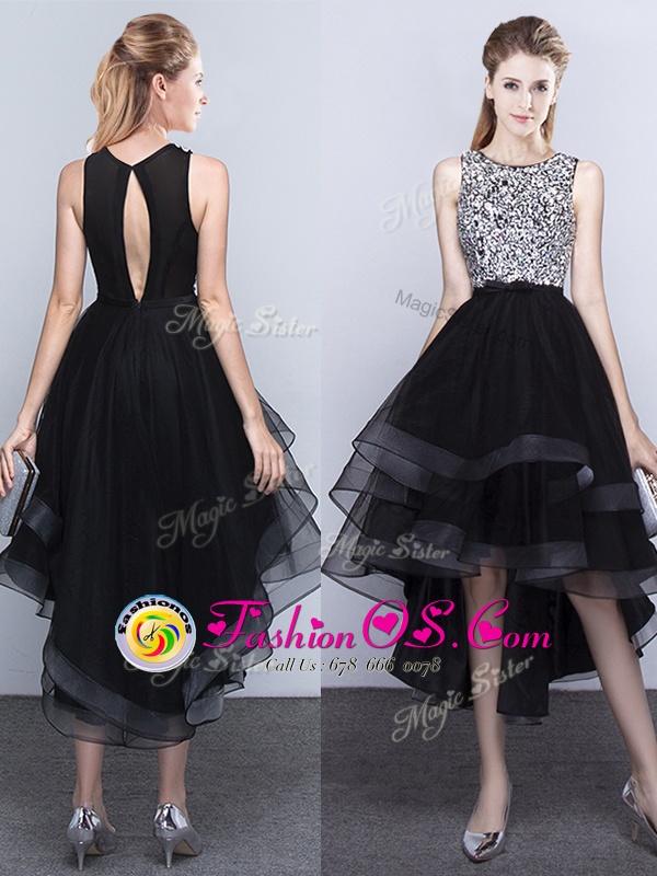 Flare Scoop Black Sleeveless High Low Beading Backless Evening Dress