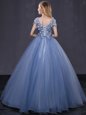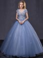 Home >  Quinceanera Dresses >  Cheap Quinceanera Dresses > Flare Scoop Sleeveless Tulle Floor Length Lace Up Quinceanera Dress in Navy Blue for with Appliques