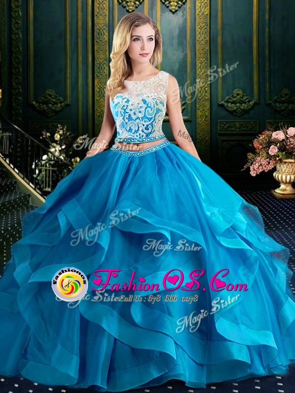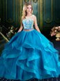 Flare Scoop Sleeveless Tulle With Brush Train Zipper Ball Gown Prom Dress in Baby Blue for with Lace and Ruffles
