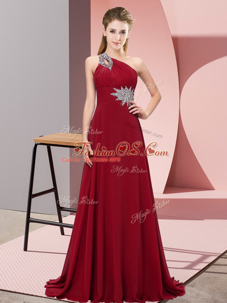 Home >  Prom Dresses >  Prom Dresses 2019 > Flare Wine Red Empire One Shoulder Sleeveless Chiffon Brush Train Lace Up Beading Prom Evening Gown