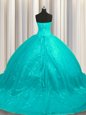 Flirting Aqua Blue Organza and Sequined Lace Up Quinceanera Dresses Sleeveless Court Train Beading and Appliques