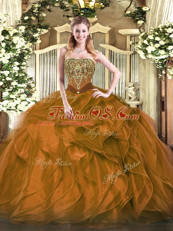 Flirting Floor Length Lace Up 15th Birthday Dress Brown for Military Ball and Sweet 16 and Quinceanera with Beading and Ruffles