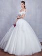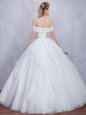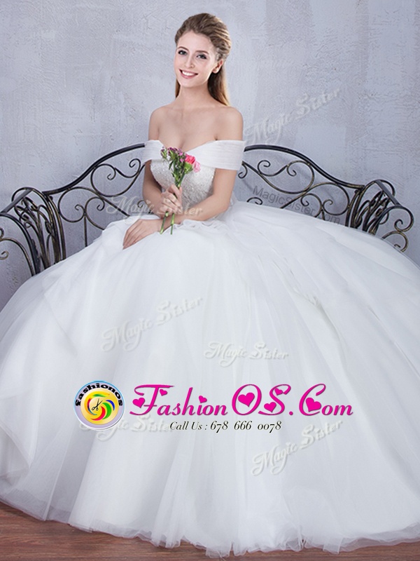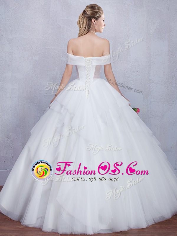 Flirting Off the Shoulder Sleeveless Lace Up Floor Length Beading and Ruffles Wedding Gowns