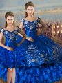 Flirting Royal Blue Satin and Organza Lace Up Off The Shoulder Sleeveless Floor Length Quinceanera Gowns Embroidery and Ruffled Layers