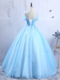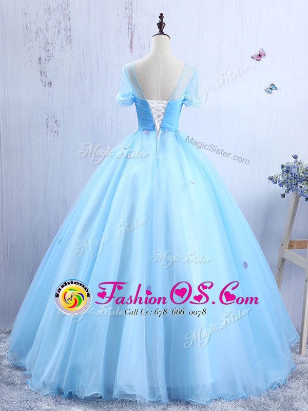 Flirting Scoop Short Sleeves Floor Length Lace Up Evening Dress Baby Blue and In for Prom with Appliques and Ruching