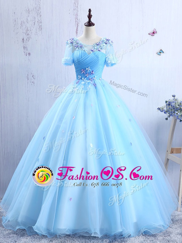 Home >  Prom Dresses >  Prom Dresses On Sale > Flirting Scoop Short Sleeves Floor Length Lace Up Evening Dress Baby Blue and In for Prom with Appliques and Ruching