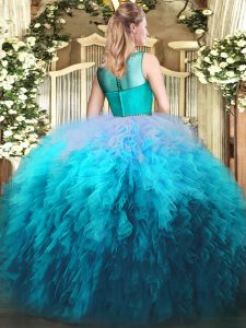 Flirting Scoop Sleeveless Sweet 16 Dress Floor Length Beading and Ruffles Multi-color Tulle