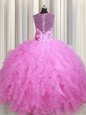 Flirting See Through Zipper Up Tulle Square Sleeveless Zipper Beading and Ruffles Quinceanera Dress in Rose Pink