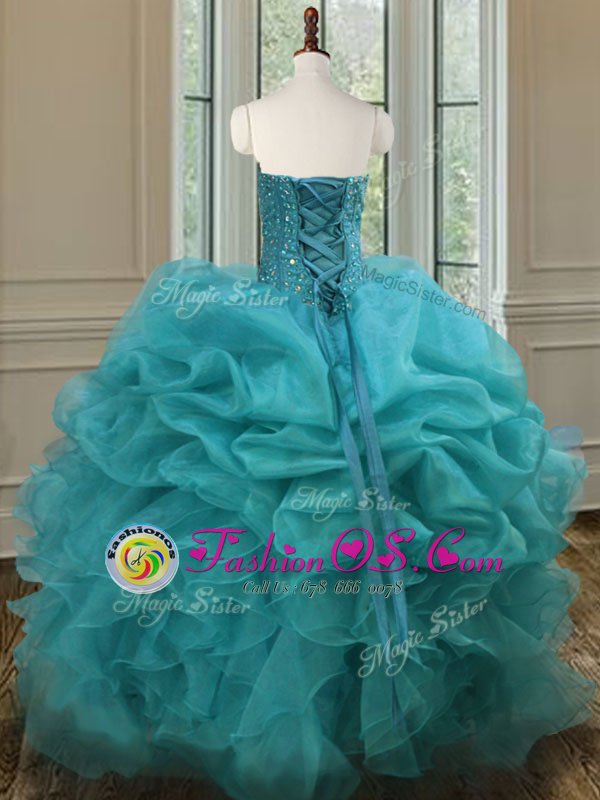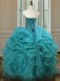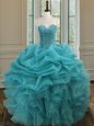 Floor Length Aqua Blue Ball Gown Prom Dress Organza Sleeveless Beading and Ruffles