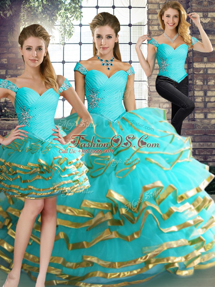 Home >  Quinceanera Dresses >  Detachable Quinceanera Skirts > Floor Length Aqua Blue Sweet 16 Dress Tulle Sleeveless Beading and Ruffled Layers