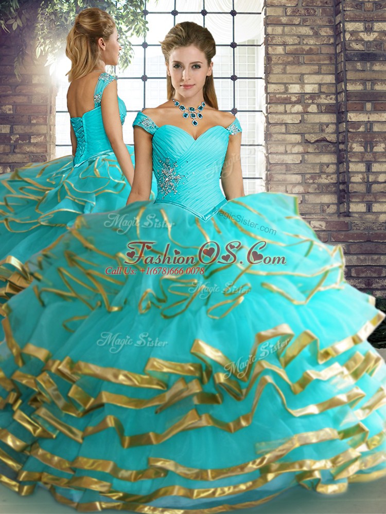 Floor Length Aqua Blue Sweet 16 Dress Tulle Sleeveless Beading and Ruffled Layers