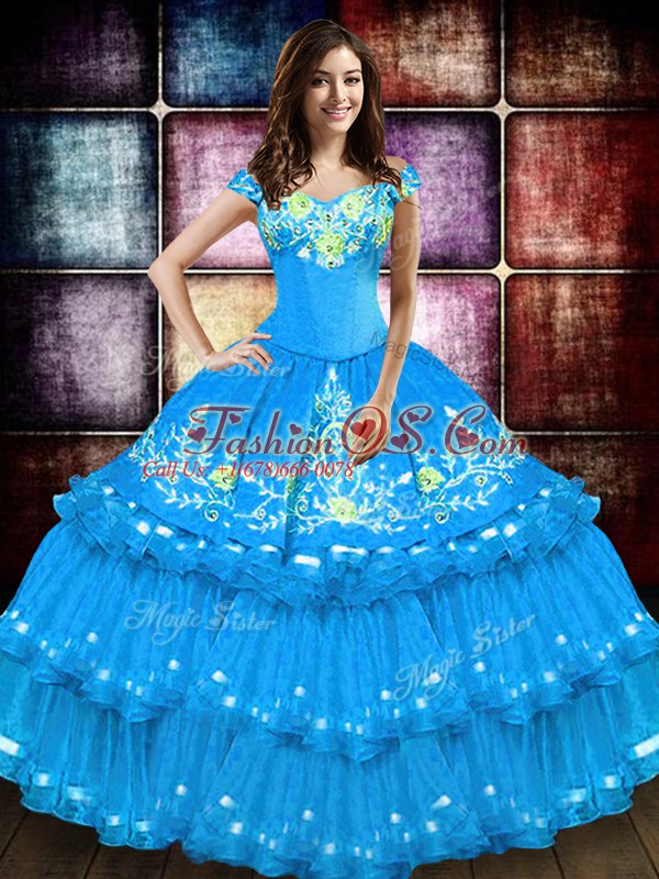 Floor Length Baby Blue Ball Gown Prom Dress Off The Shoulder Sleeveless Lace Up