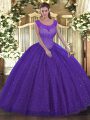 Floor Length Backless Ball Gown Prom Dress Purple for Military Ball and Sweet 16 and Quinceanera with Beading