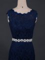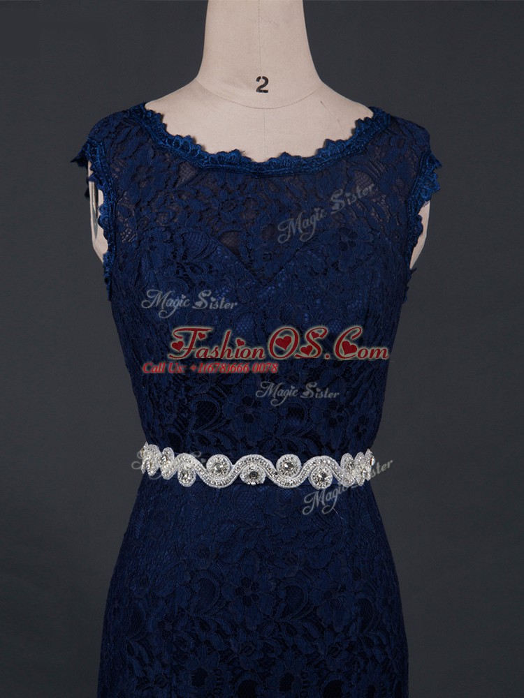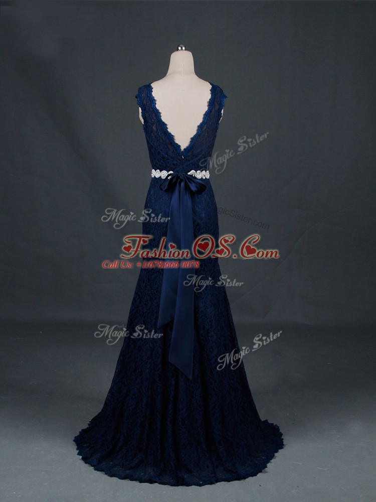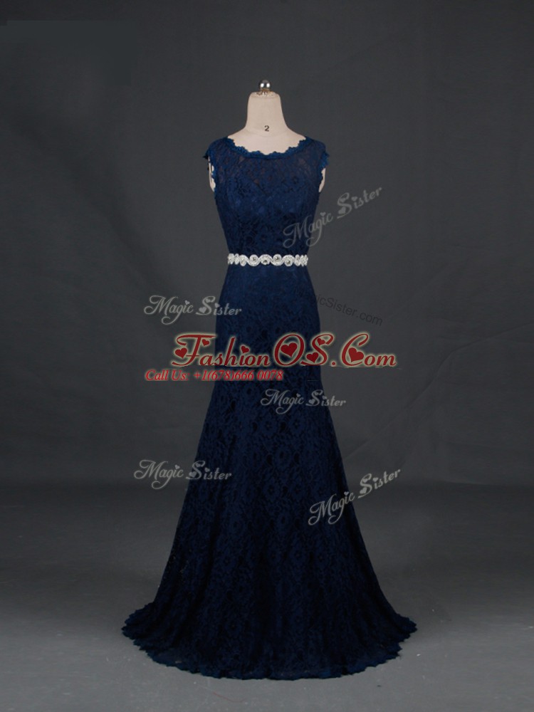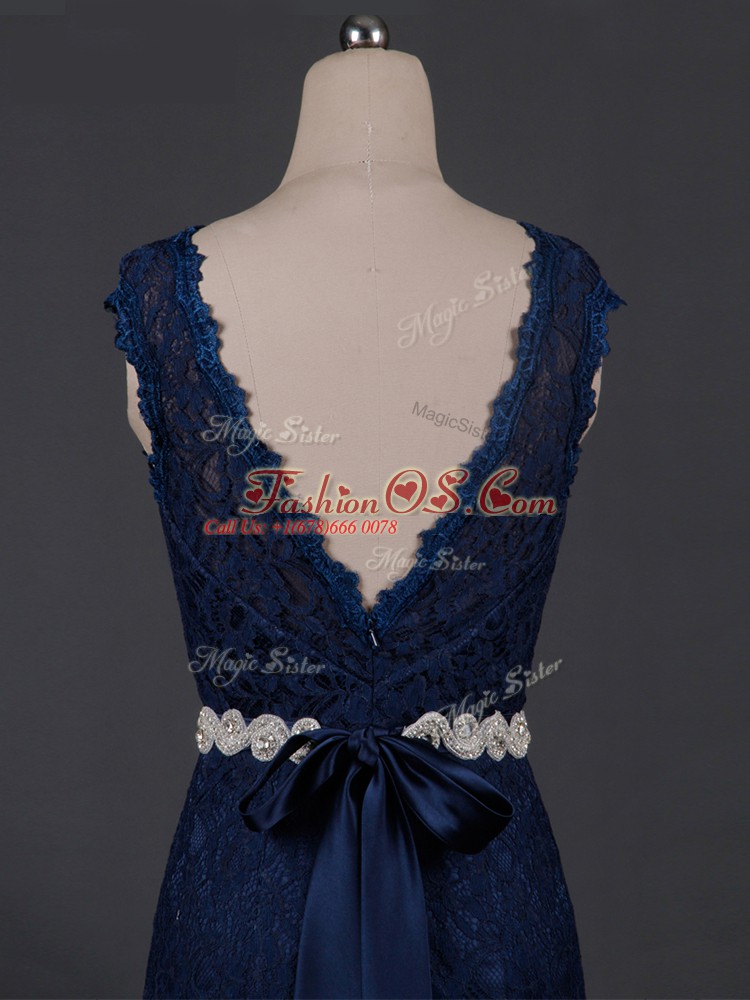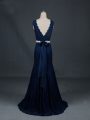 Floor Length Backless Mother Of The Bride Dress Navy Blue for Prom and Military Ball and Sweet 16 and Beach with Beading