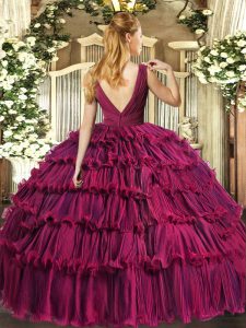 Floor Length Backless Quinceanera Dresses Fuchsia for Sweet 16 and Quinceanera with Beading and Ruffled Layers