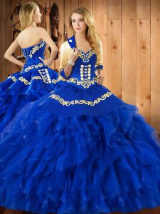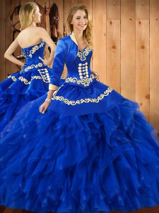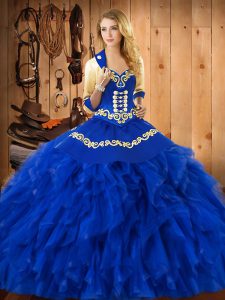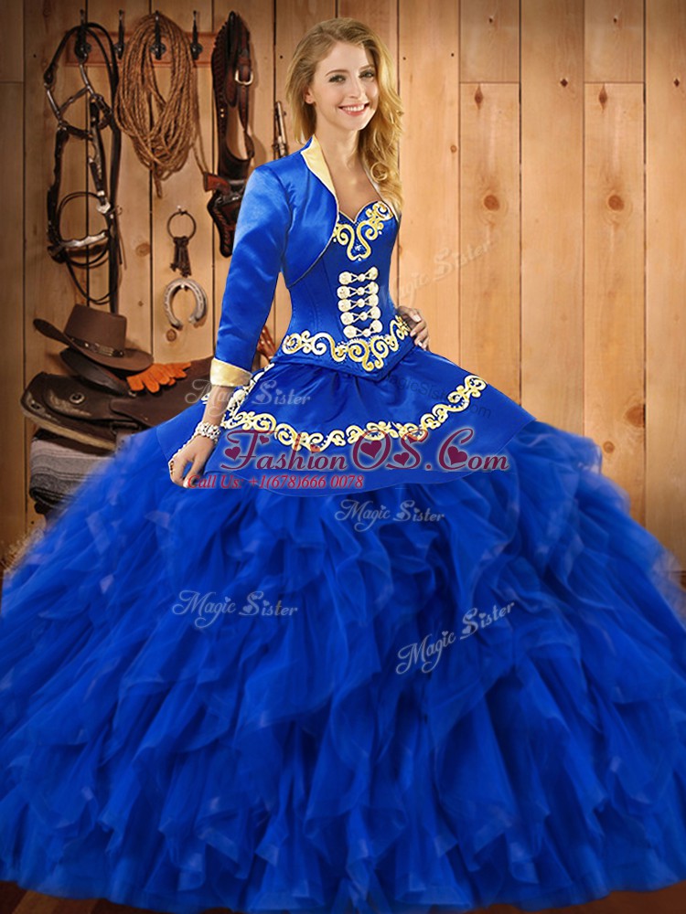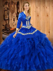 Floor Length Blue Ball Gown Prom Dress Satin and Organza Sleeveless Embroidery and Ruffles