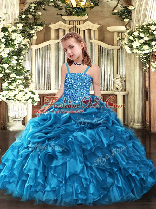 Home >  Special Occasion Dresses >  Lovely Little Girl Pageant Dresses > Floor Length Blue Little Girl Pageant Dress Organza Sleeveless Beading and Ruffles