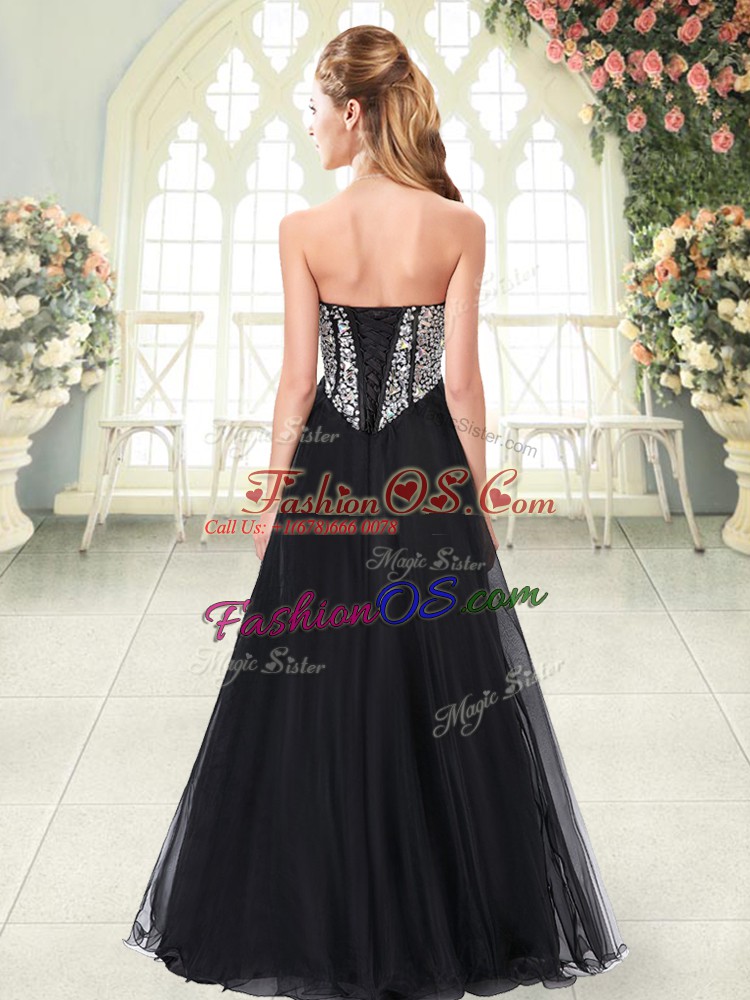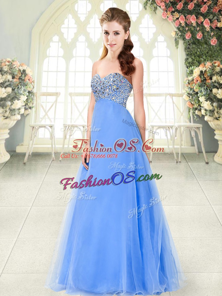 Floor Length Blue Prom Gown Tulle Sleeveless Beading