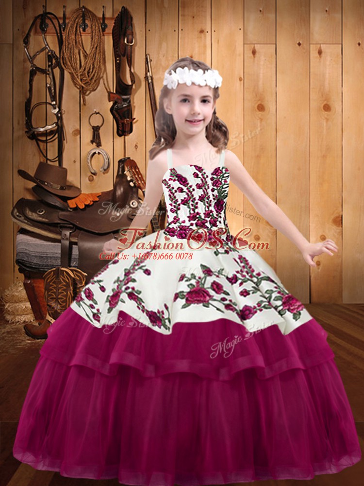 Floor Length Fuchsia Little Girl Pageant Gowns Straps Sleeveless Lace Up