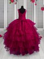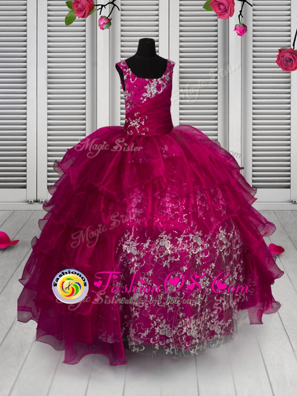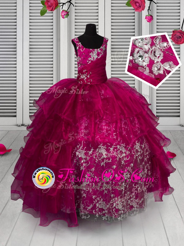 Floor Length Fuchsia Pageant Gowns For Girls Organza Sleeveless Appliques and Ruffled Layers