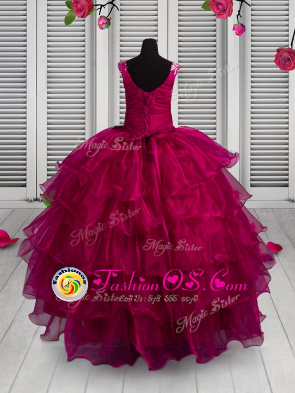 Home >  Special Occasion Dresses >  Mini Quinceanera Dresses > Floor Length Fuchsia Pageant Gowns For Girls Organza Sleeveless Appliques and Ruffled Layers