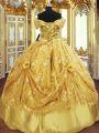 Home >  Quinceanera Dresses >  Fast Delivery Quinceanera Dresses > Floor Length Gold 15 Quinceanera Dress Tulle Sleeveless Beading and Appliques and Hand Made Flower