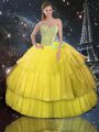 Floor Length Gold Quince Ball Gowns Organza Sleeveless Ruffled Layers and Sequins