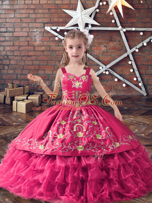 Floor Length Hot Pink Little Girl Pageant Gowns Straps Sleeveless Lace Up
