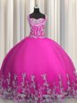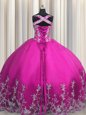 Floor Length Lace Up 15 Quinceanera Dress Fuchsia and In for Military Ball and Sweet 16 and Quinceanera with Beading and Appliques