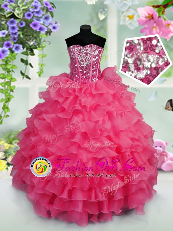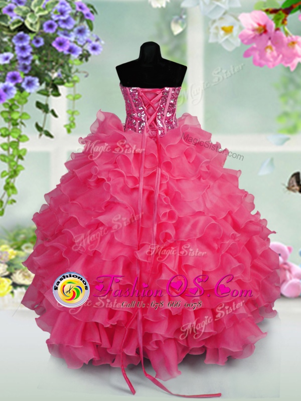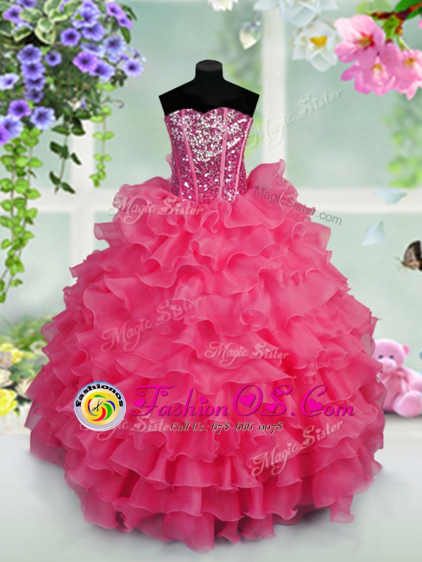 Floor Length Lace Up Child Pageant Dress Hot Pink and In for Party and Wedding Party with Ruffled Layers and Sequins