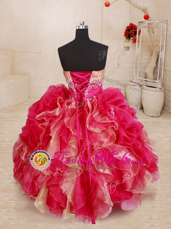 Floor Length Lace Up Flower Girl Dresses Red and In for Quinceanera and Wedding Party with Beading and Ruffles