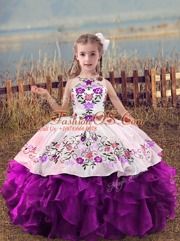 Floor Length Lace Up Girls Pageant Dresses Purple for Wedding Party with Embroidery and Ruffles
