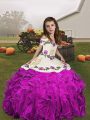 Floor Length Lace Up Kids Pageant Dress Fuchsia for Party and Wedding Party with Embroidery and Ruffles