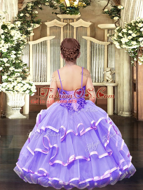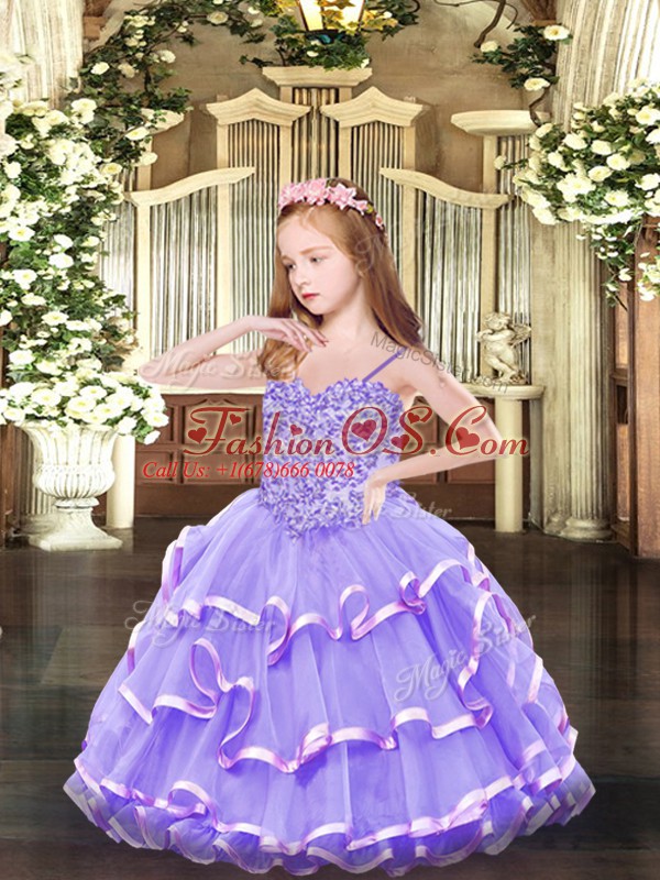 Floor Length Lace Up Little Girl Pageant Gowns Lavender for Party and Quinceanera with Appliques and Ruffled Layers