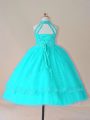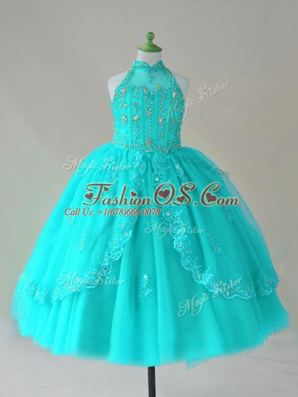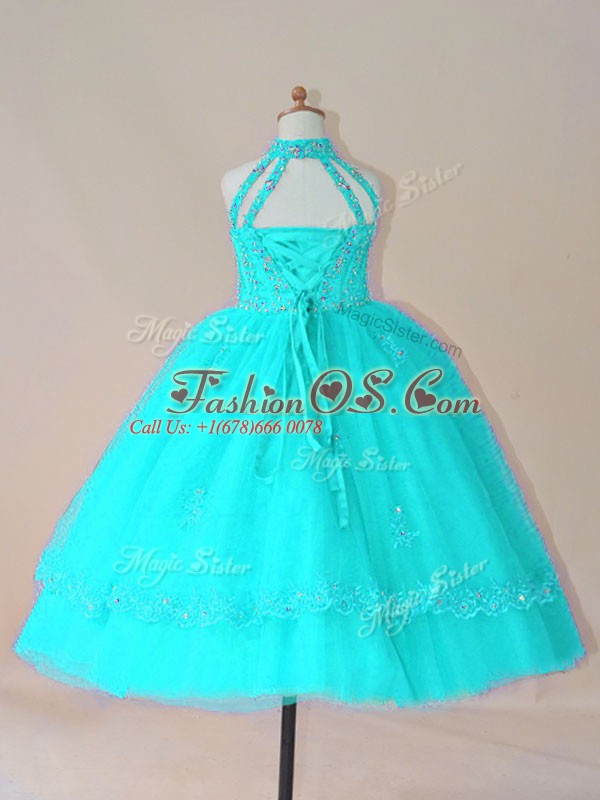 Floor Length Lace Up Little Girls Pageant Gowns Aqua Blue for Wedding Party with Beading and Appliques
