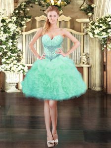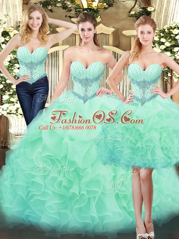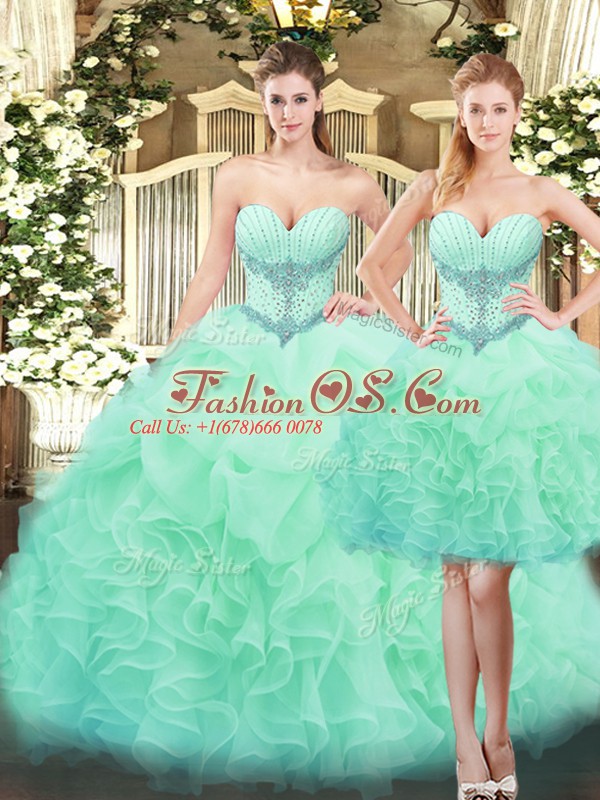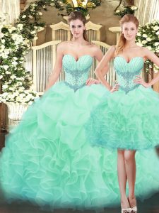 Floor Length Lace Up Quince Ball Gowns Apple Green for Military Ball and Sweet 16 and Quinceanera with Beading and Ruffles
